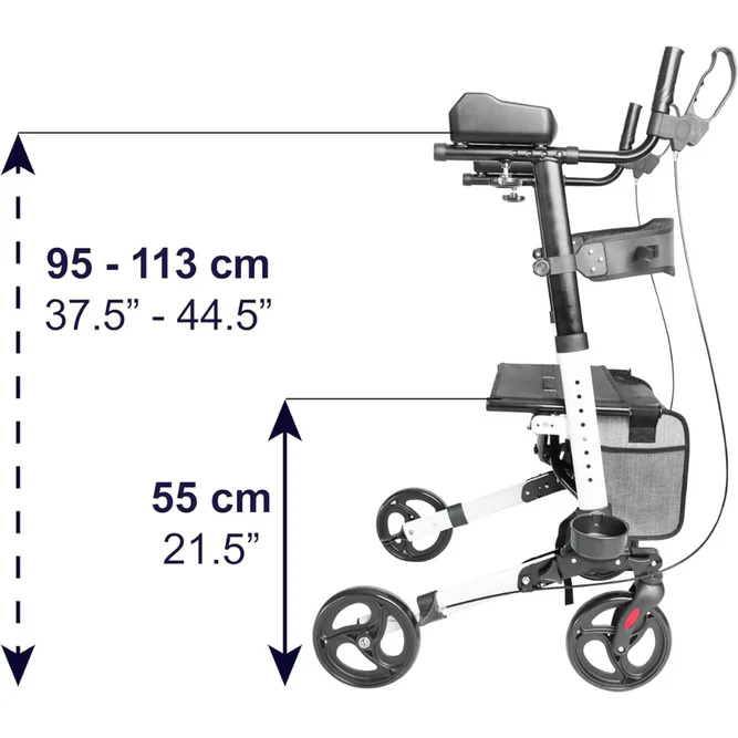 este andador se adapta perfectamente a la altura del usuario gracias a sus 8 regulaciones de altura de los reposabrazos (95 – 113 cm). Su sencillo sistema de plegado permite almacenar y transportar el andador fácilmente (67 x 109,5 x 25 cm). IMPORTANTE: mide la altura de tu antebrazo al suelo con los codos en una posición de 90º.