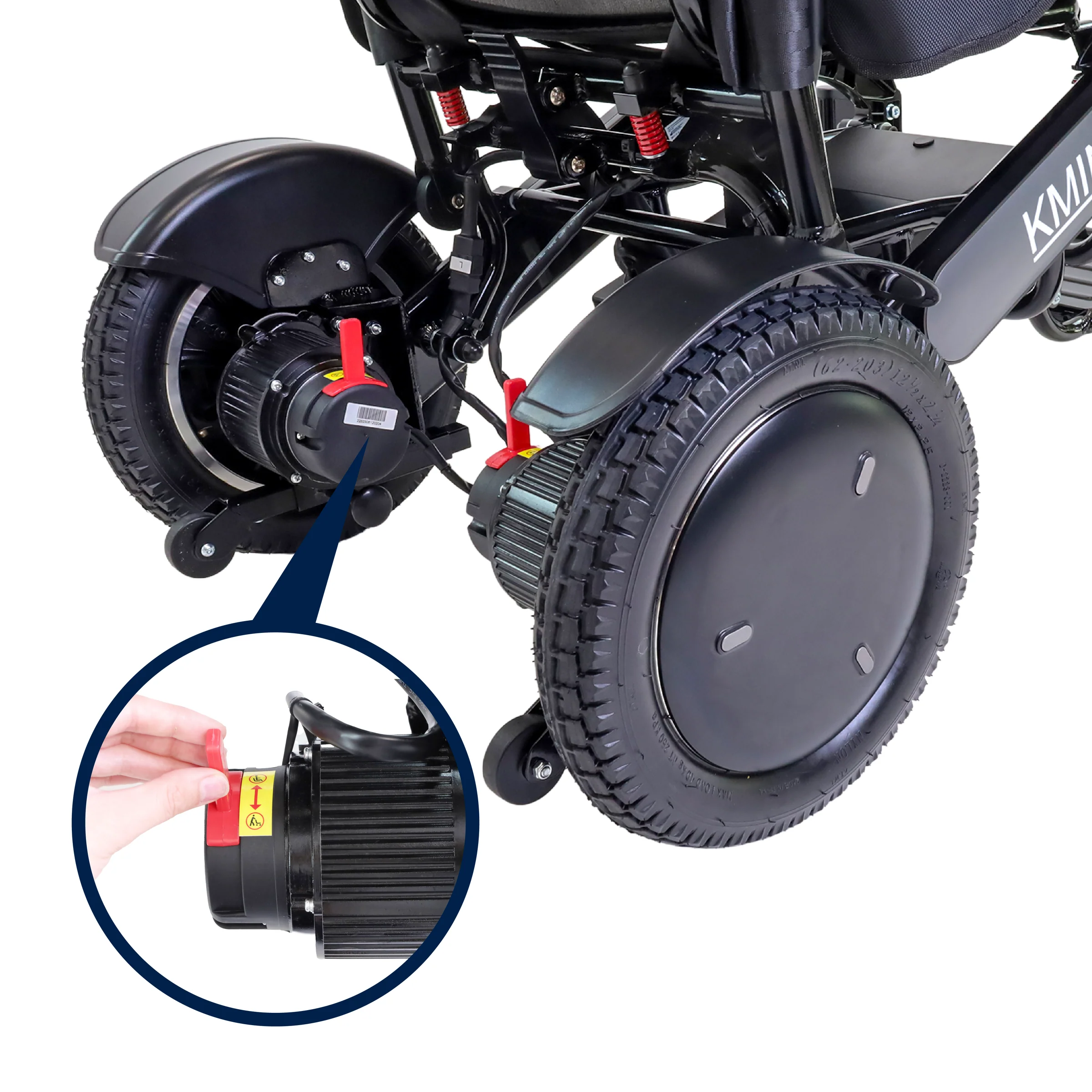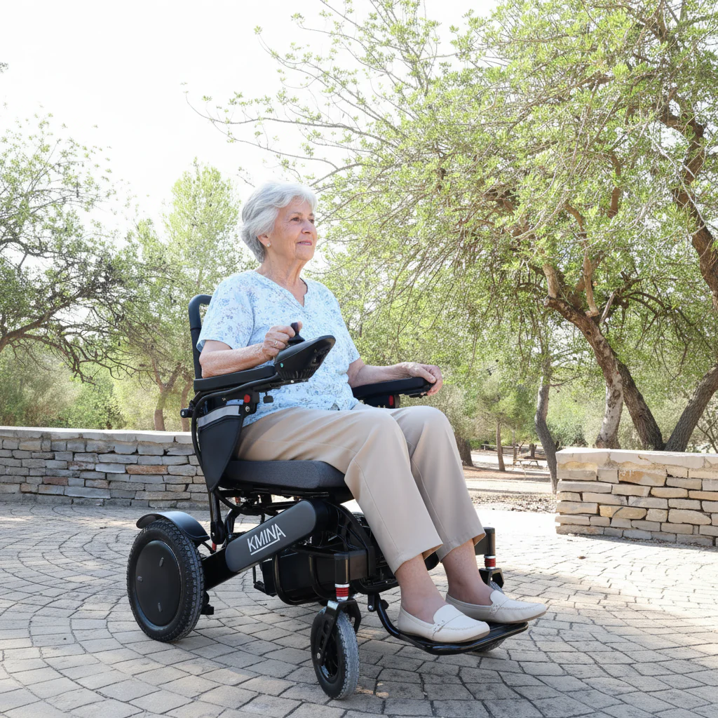 La silla de ruedas eléctrica integra freno electromagnético: al soltar el joystick se detiene al instante, evitando movimientos en pendientes y aportando seguridad sin esfuerzo.