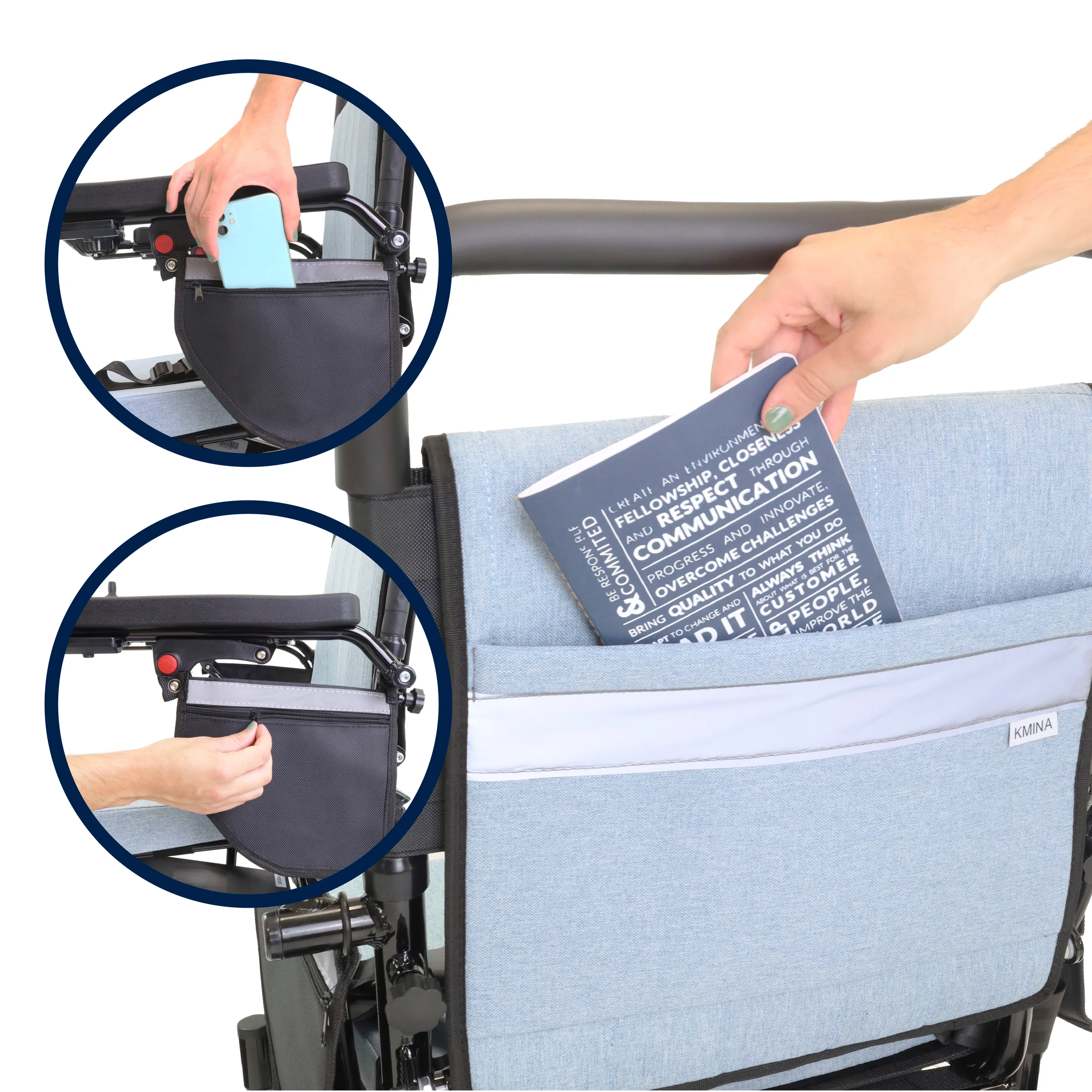 - Incluye, bolsillo trasero, bolsillos laterales, batería extraíble, cinturón de seguridad y ruedas antivuelco.