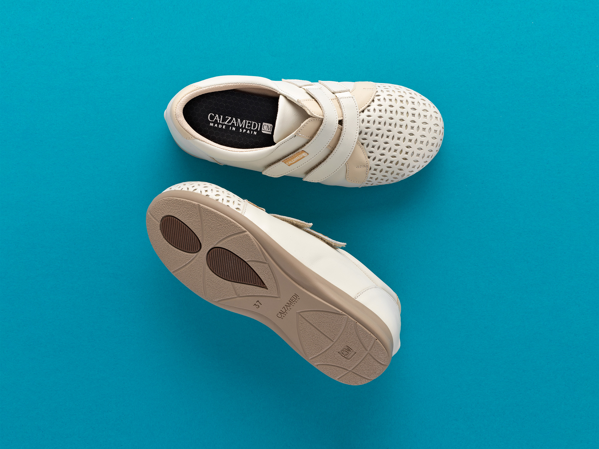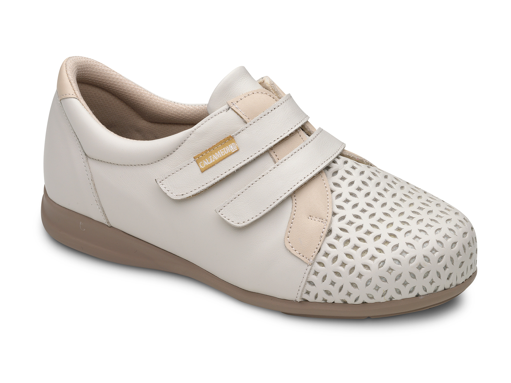 Zapato fabricado en pieles de colores clásicos pero con un discreto picado en la zona de la pala para aportar frescura al pie en primavera-verano. Este modelo destaca por su forro interno que absorbe las costura y protege el pie de las personas diabéticas en todo momento. Lleva plantilla extraíble y cierre de doble velcro que aportan un ajuste perfecto al pie evitando las rozaduras indeseadas en personas diabéticas.